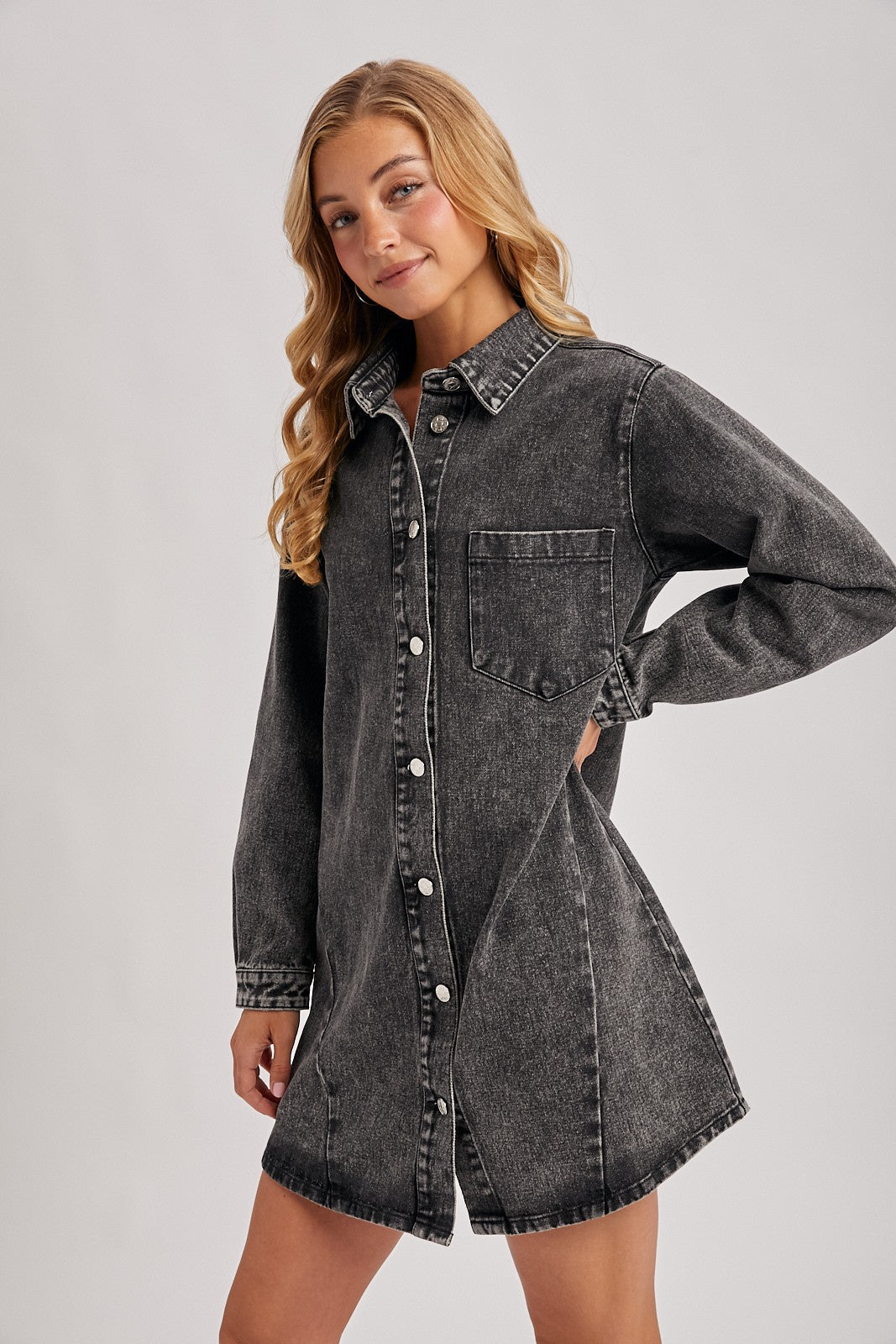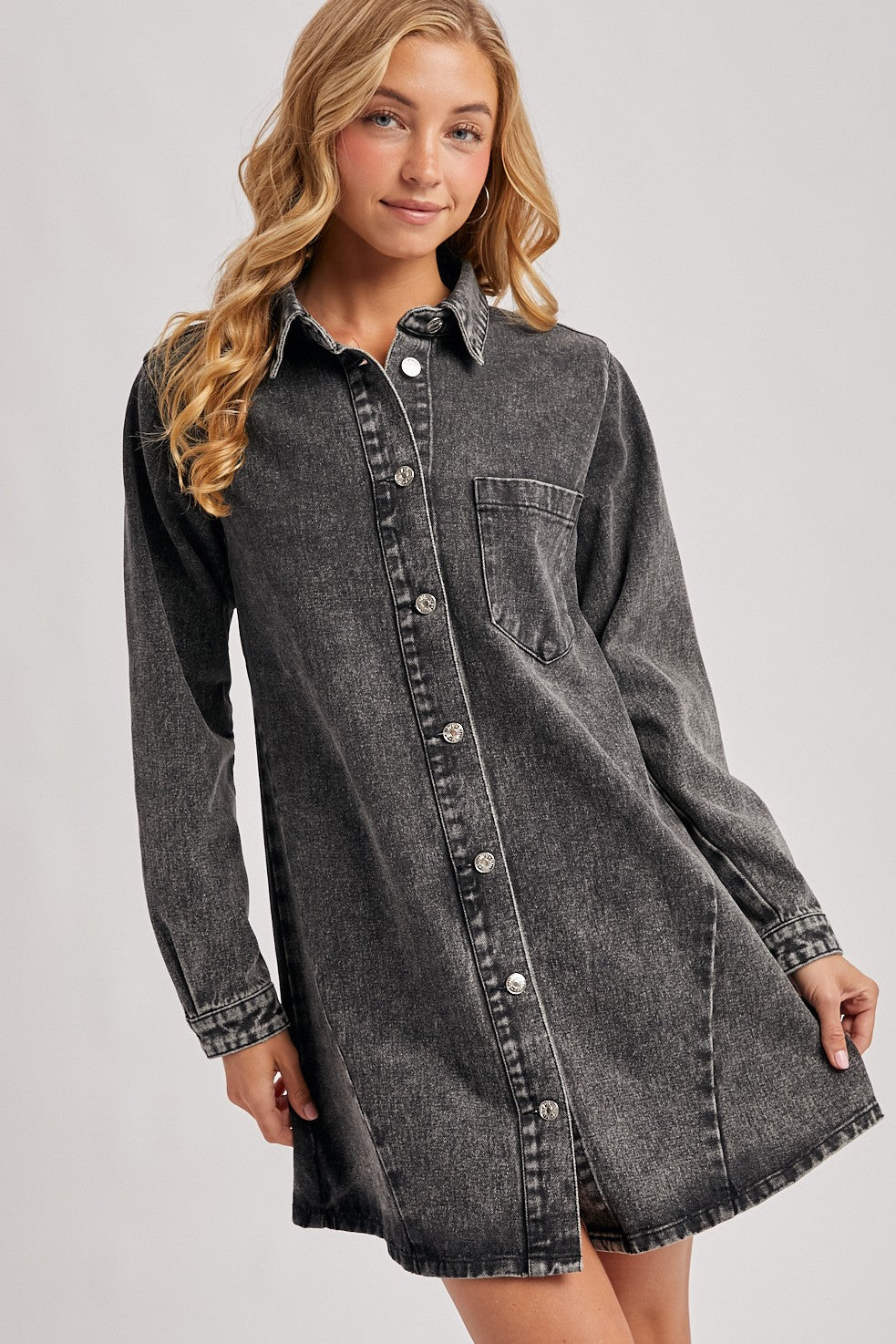 Effortlessly cool and endlessly versatile, our Denim Dreamin' is your new go-to for casual chic days. Designed in a soft, washed black denim, this button-down dress blends timeless style with a laid-back edge. The relaxed fit and classic collar give it that perfect balance between comfort and sophistication.