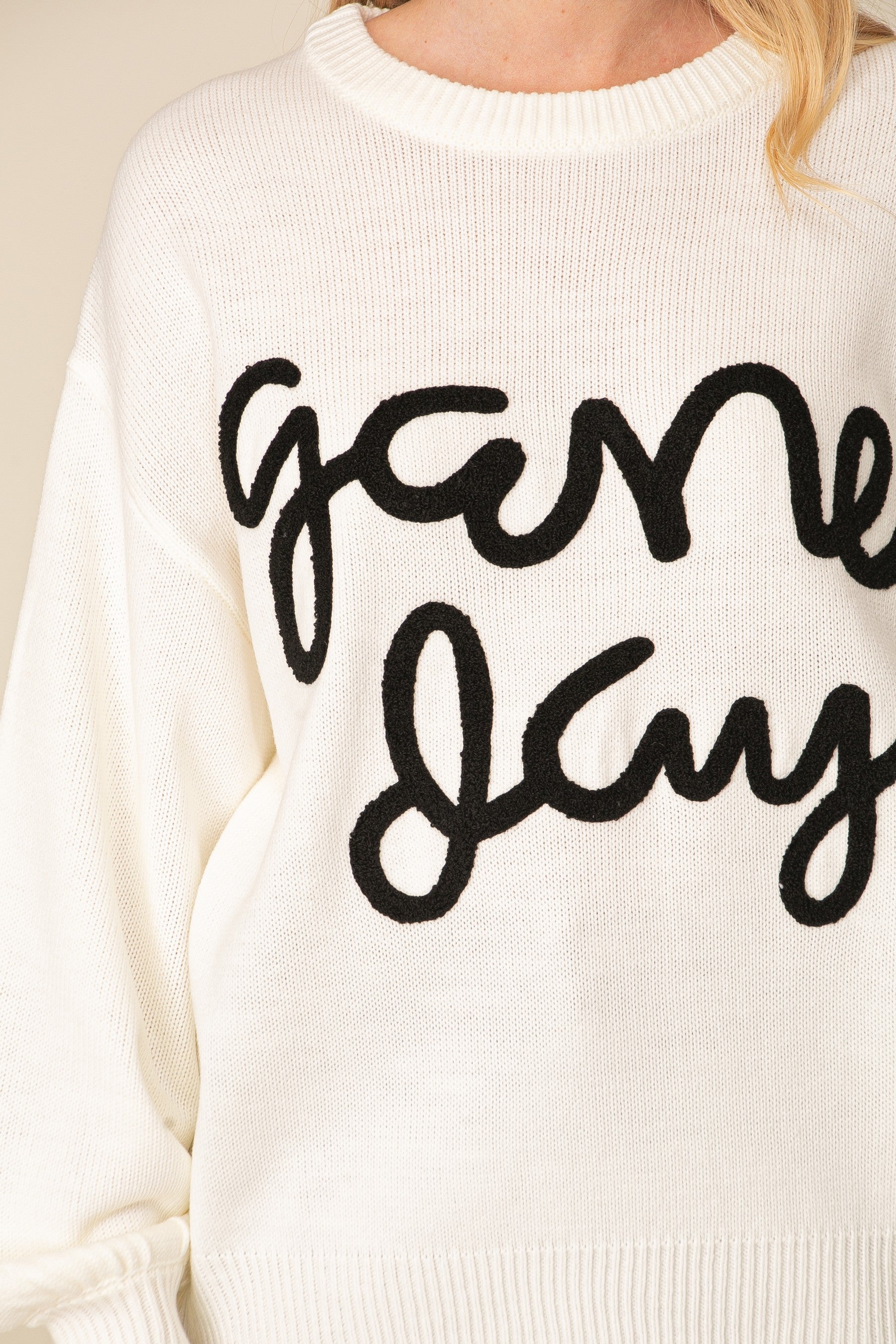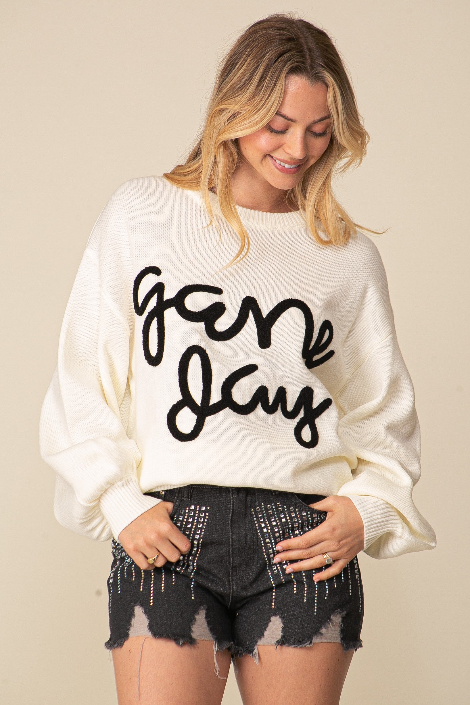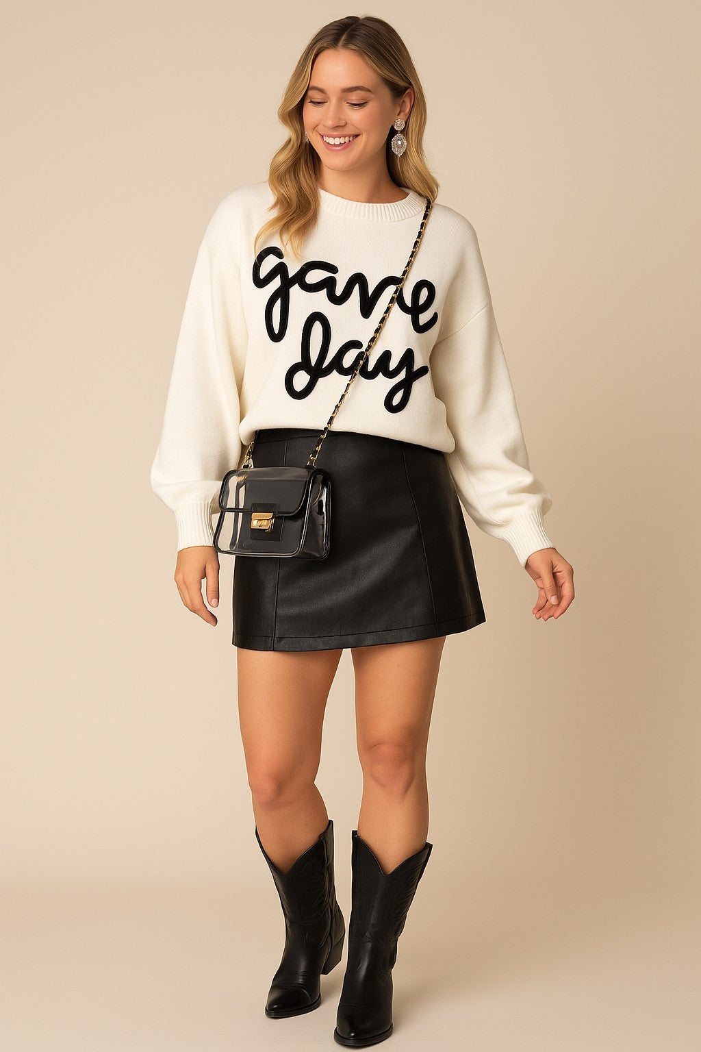 Cheer on your favorite team in style with our Gameday Girly Sweater! This classic white pullover features “Game Day” in chic black cursive lettering across the front — the perfect mix of sporty and stylish. Crafted from a soft, midweight knit, it’s designed for all-day comfort whether you’re tailgating, watching from the stands, or celebrating at home.